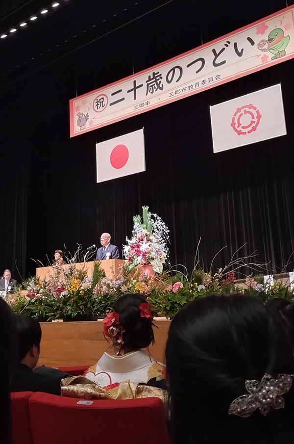 1月12日(祝)三郷市文化会館において「二十歳のつどい」が開催されました。市長・来賓のスピーチ、20歳の代表による「二十歳の主張」の発表、抽選会などが行われました。今年度に20歳になる1,206名のうち、794名が参加しました。皆さんの今後の活躍を期待します。